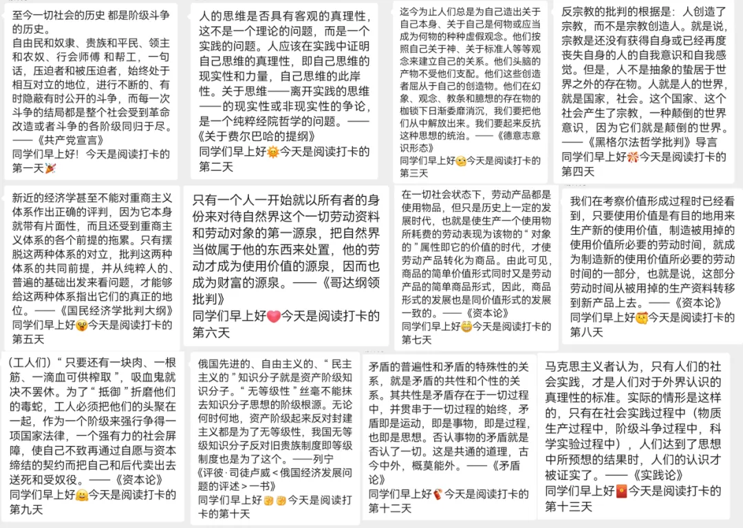 书卷多情似故人,晨昏忧乐每相亲。打卡活动期间,同学们在每日清晨都会收到工作人员于打卡群中发送的早安督促。每日的经典语录都浸润着真理与哲思,勉励同学们以更加饱满的热情覃思真理、明理增慧。一起来看看21天早安打卡经典语录吧——